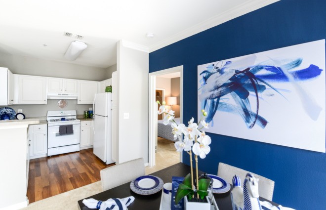 Inspired by Santorini, SR/A established a strong blue and white theme for the model units of this condominium complex. New oak hardwood flooring in the kitchen creates a nice visual contrast to the rest of the unit.